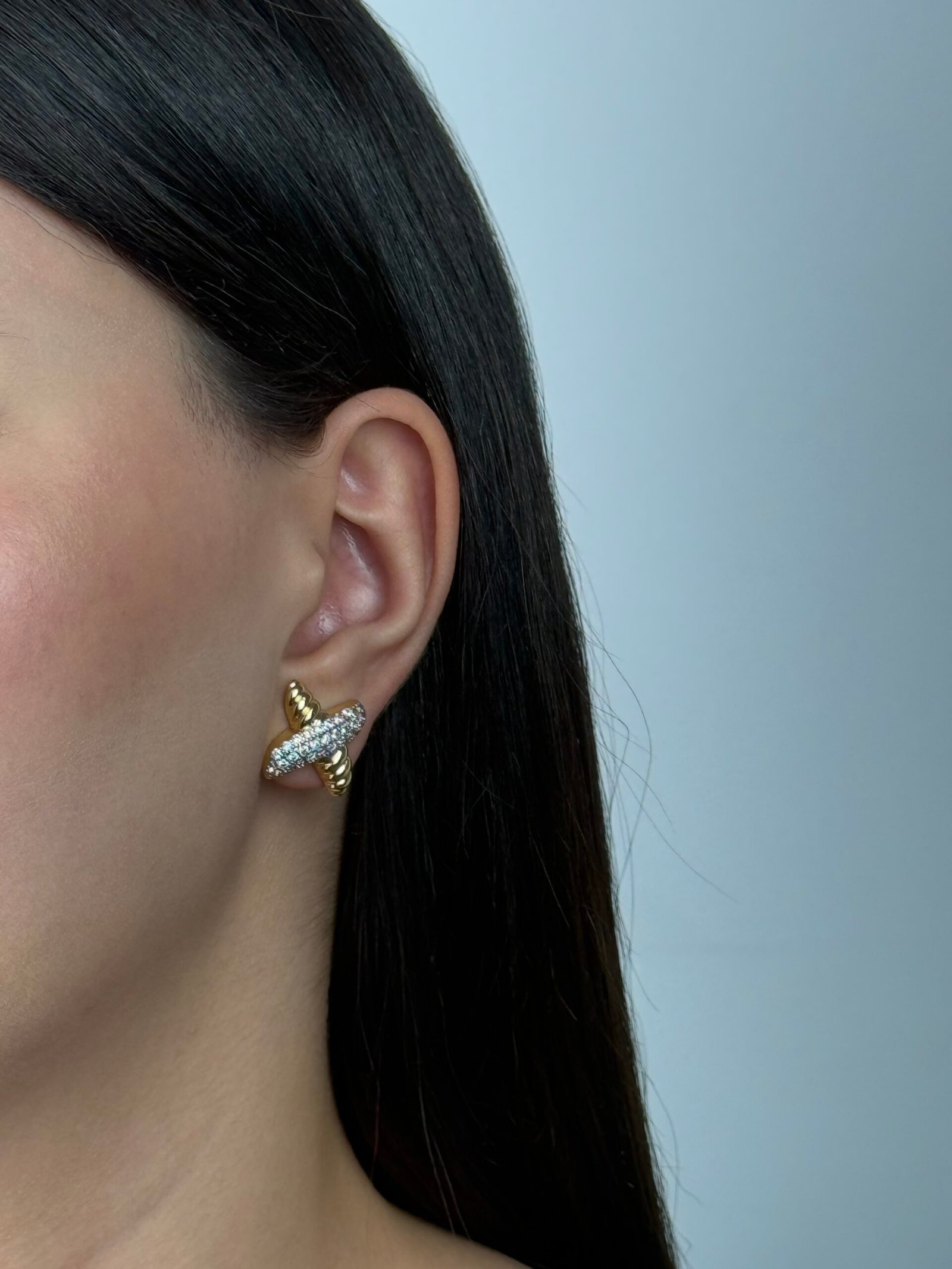 Une Paire de boucle d’oreille qui sort du cadre. Son design entrelacé crée un effet croisé audacieux, mêlant or texturé et pavage scintillant. Le contraste entre la structure dorée sculptée et la surface brillante apporte du relief et du caractère.