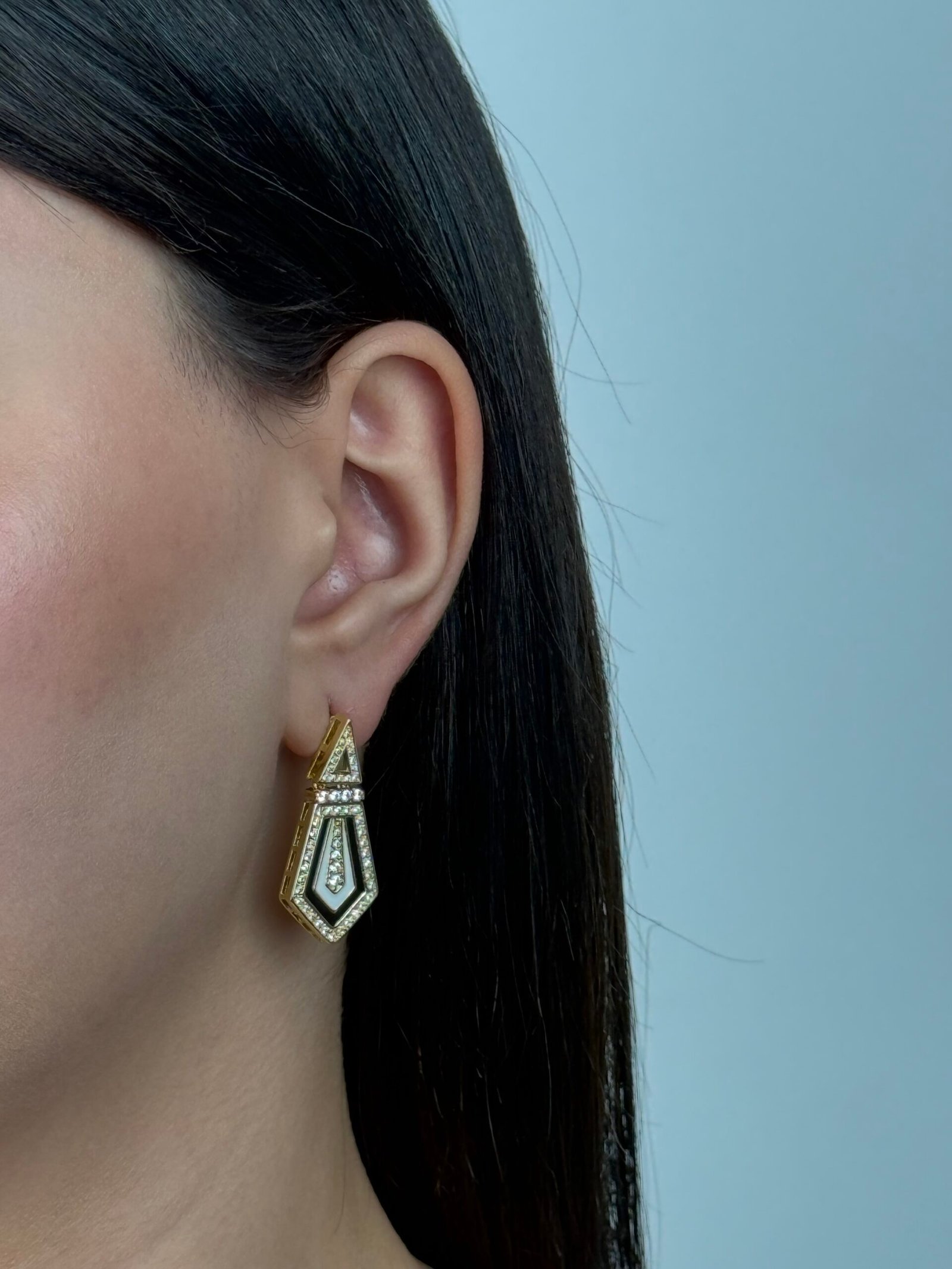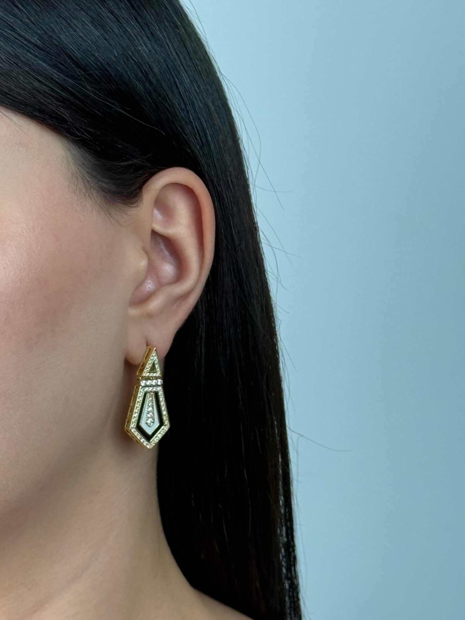 De forme géométrique allongée, elles se composent d’un triangle délicat en haut qui se prolonge par un motif pentagonal structuré. Le design joue sur les contrastes : une base dorée lumineuse, subtilement sertie de petites pierres scintillantes .