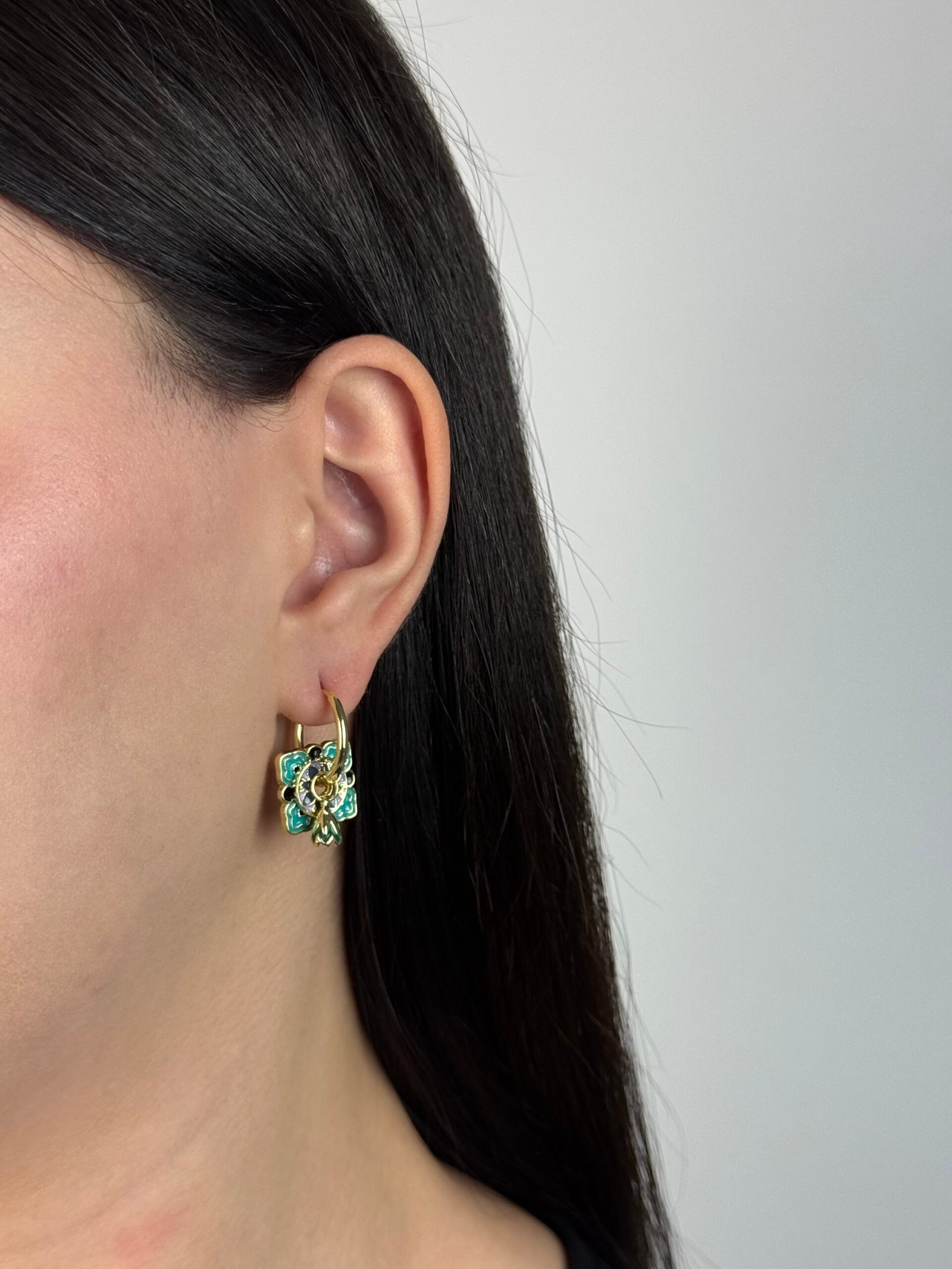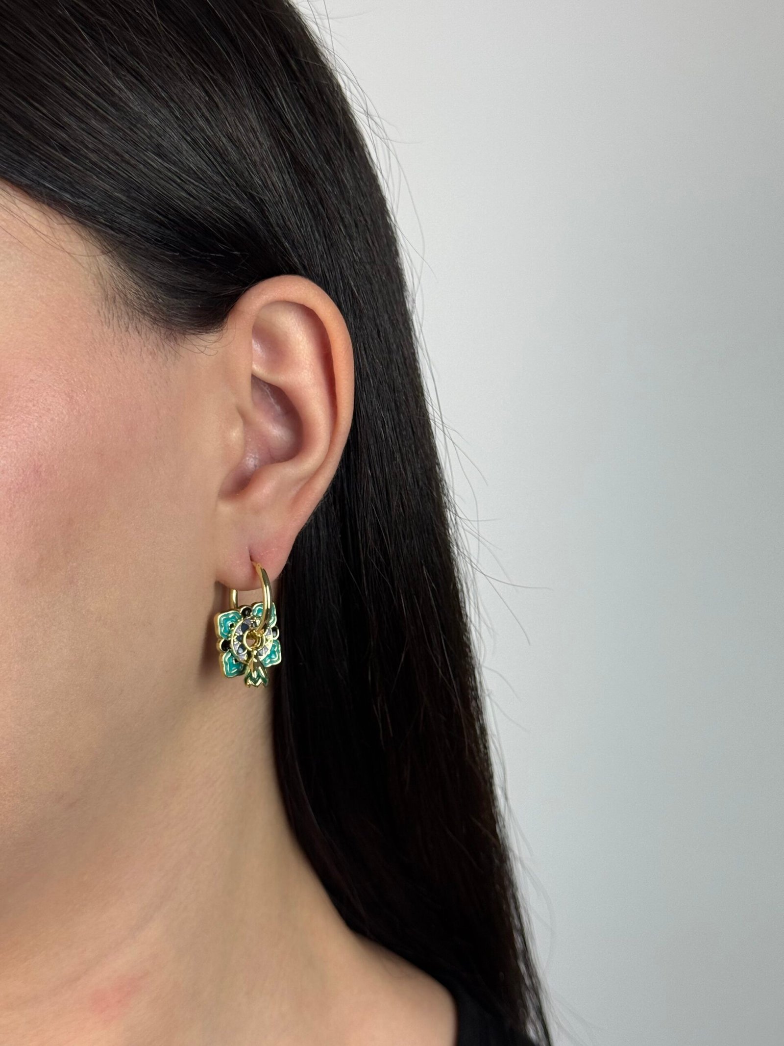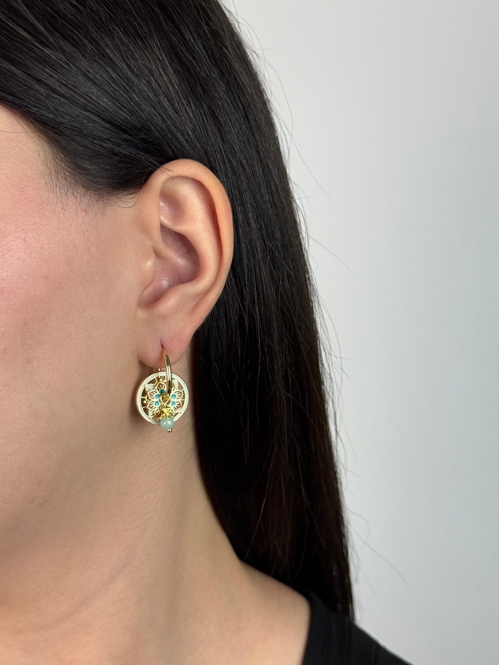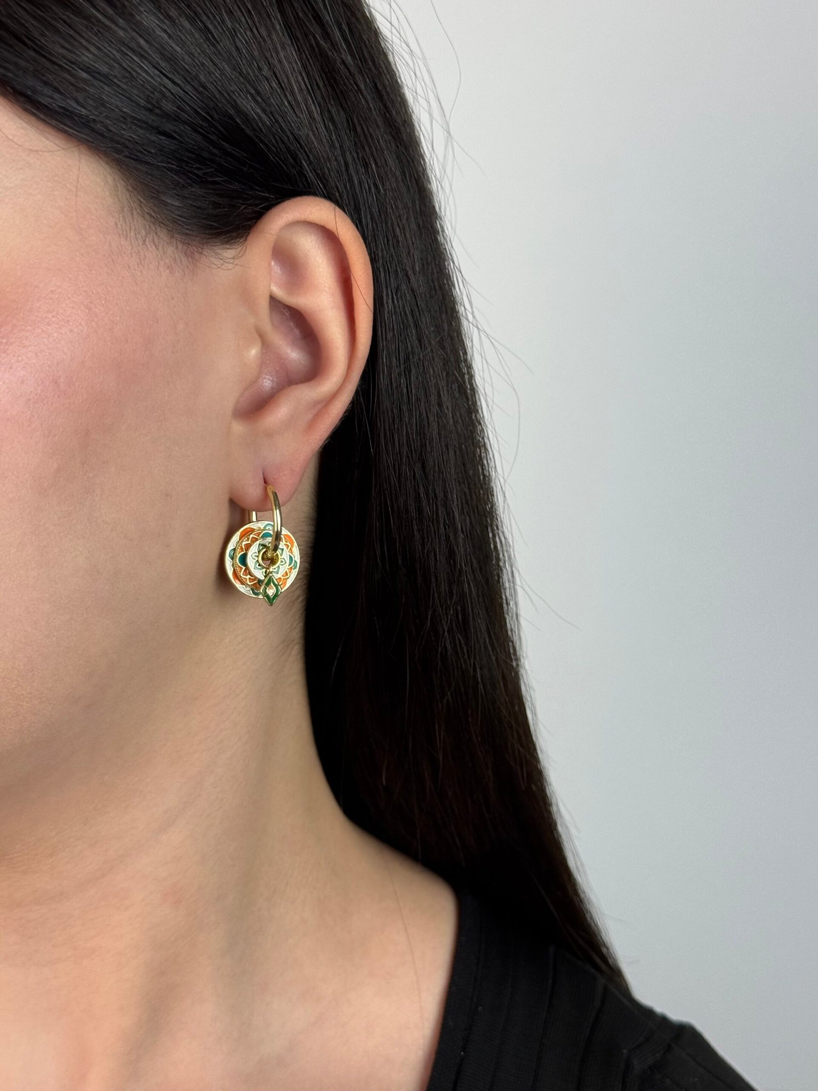 De petites créoles dorées rehaussées de pampilles circulaires émaillées.