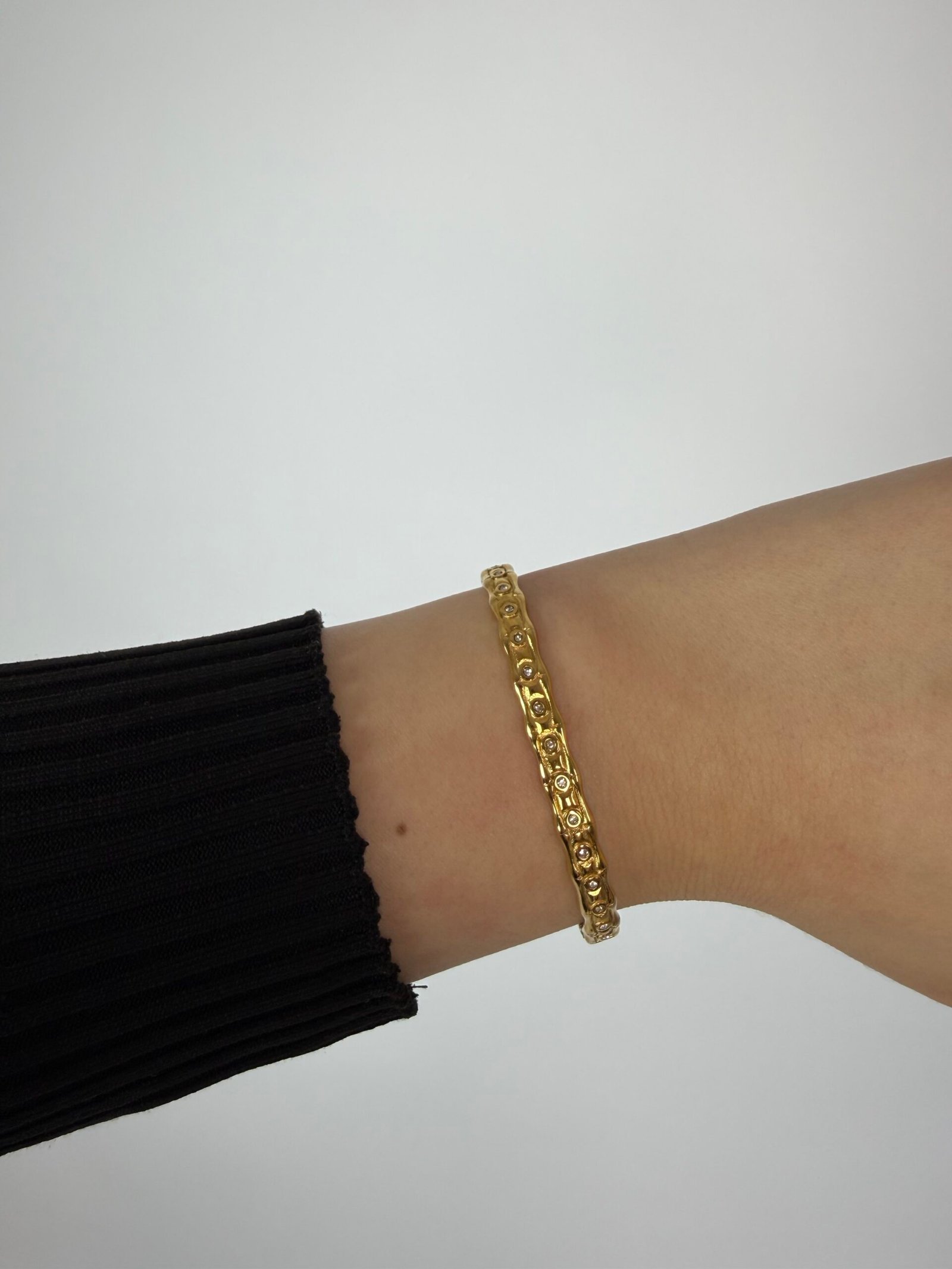 Un bracelet rigide au fini doré, caractérisé par une texture perlée et un relief régulier. Chaque section bombée est ornée d’un petit cristal incrusté, apportant une brillance discrète et raffinée. C’est une pièce intemporelle, conçue pour capturer la lumière avec finesse.