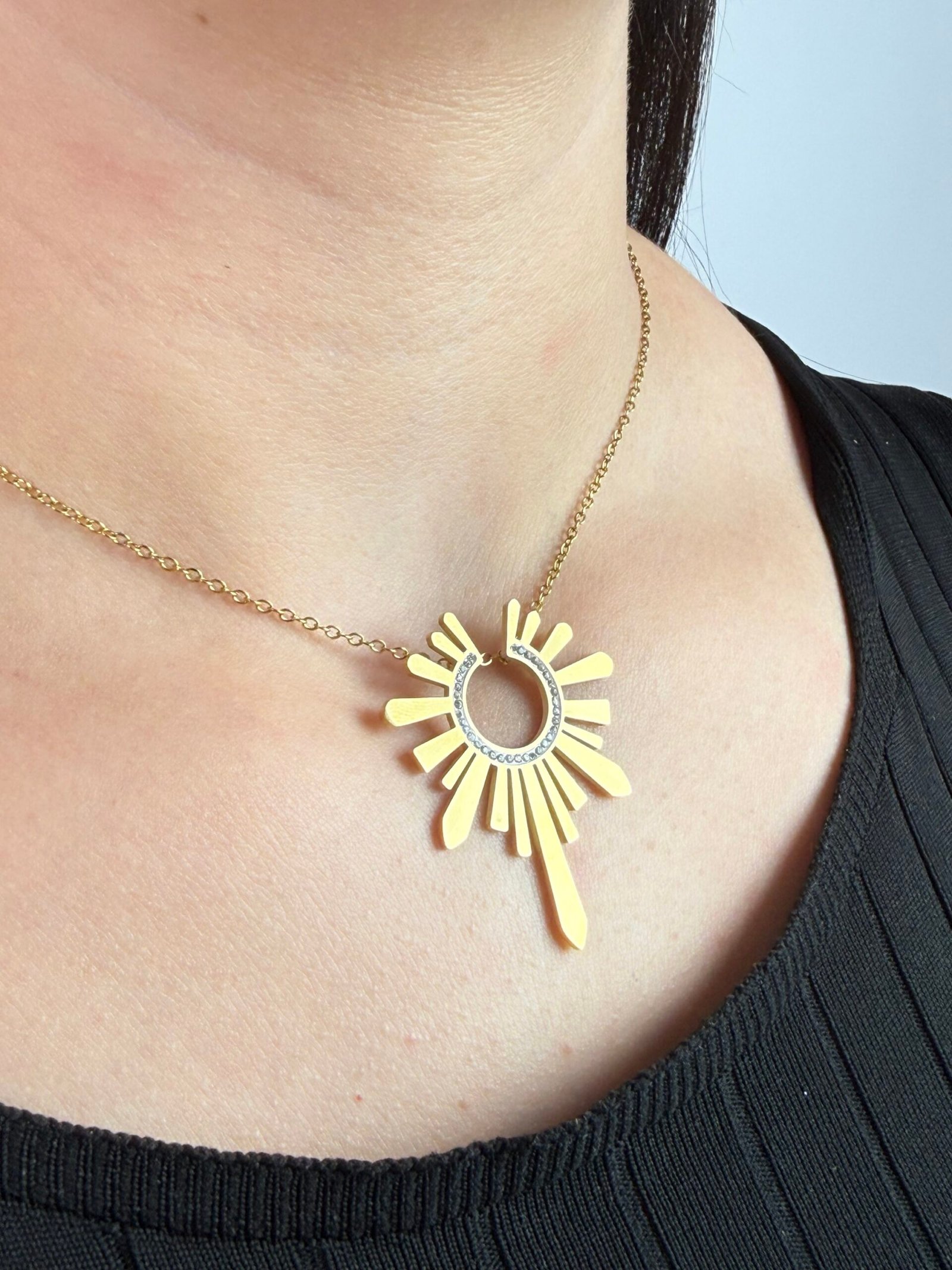Inspiré par l’astre solaire, ce pendentif présente un cercle central évidé, délicatement serti de cristaux scintillants sur sa moitié inférieure. De ce cœur radieux s’échappent des rayons géométriques en acier doré, créant une silhouette dynamique et sculpturale.