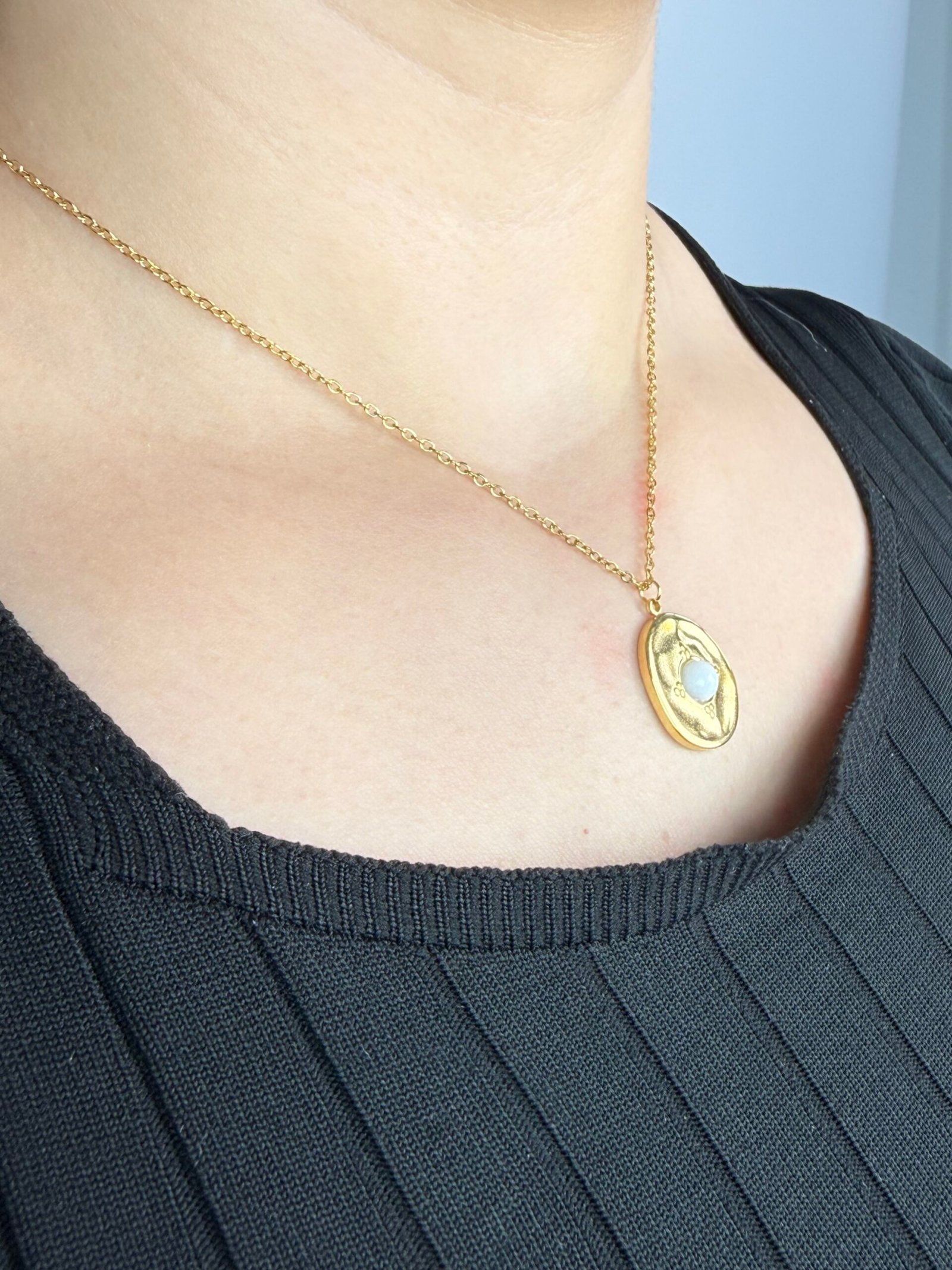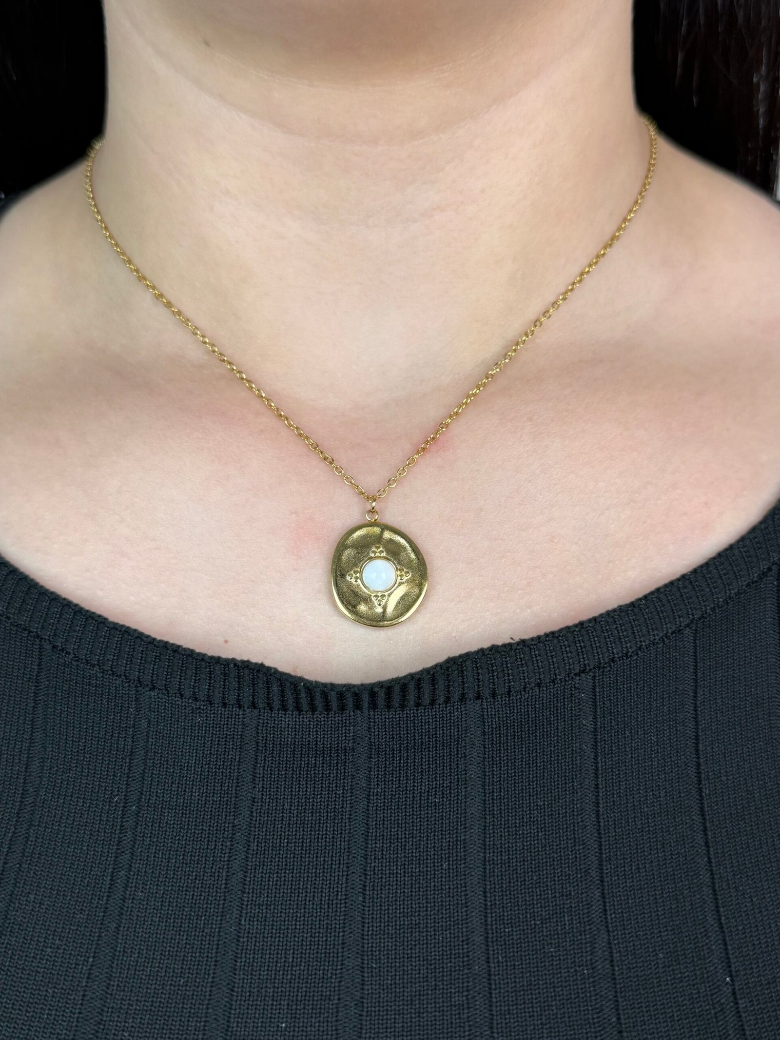Un collier fin et délicat composé d’une chaîne dorée et d’un pendentif circulaire.