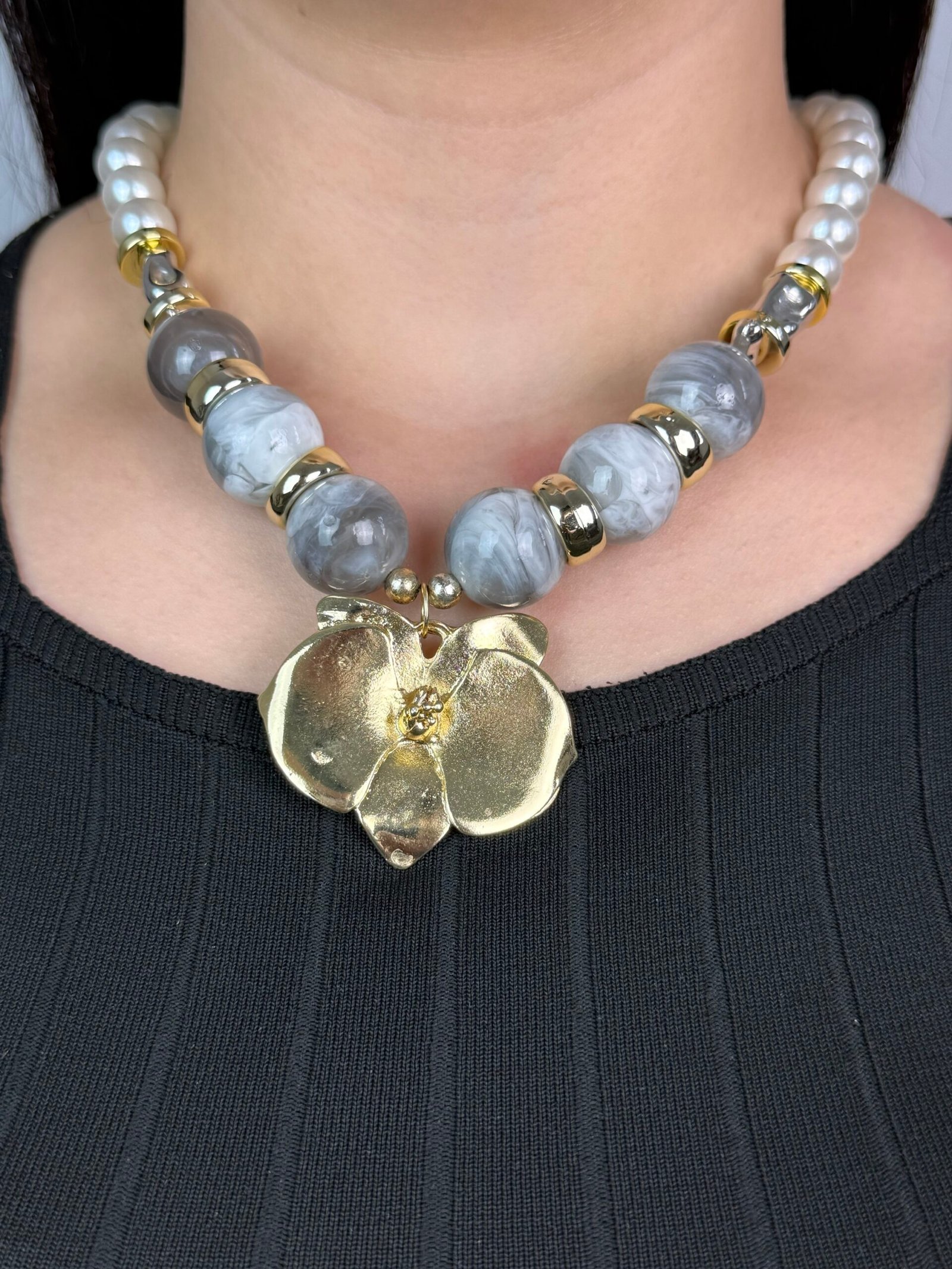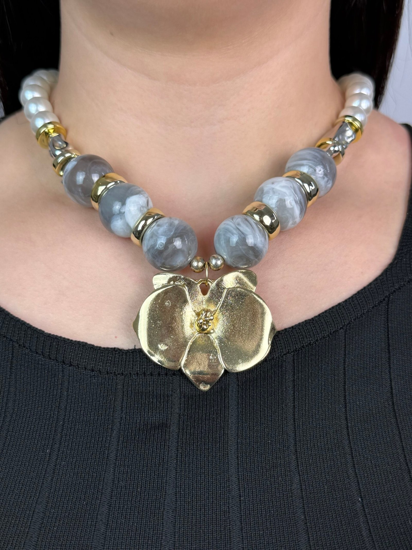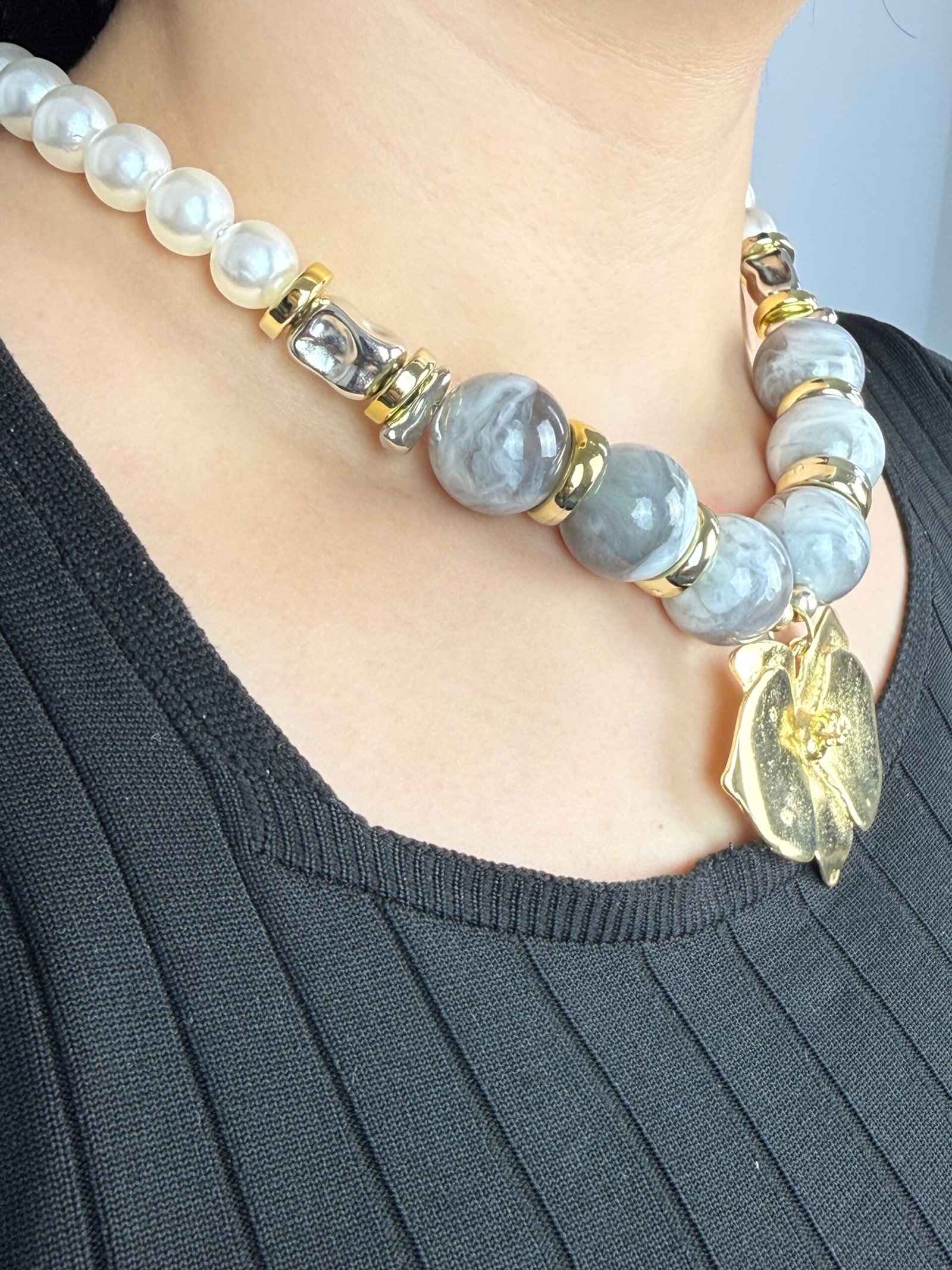 Un collier imposant composé de grosses perles alternant entre le blanc nacré et un gris marbré effet pierre.