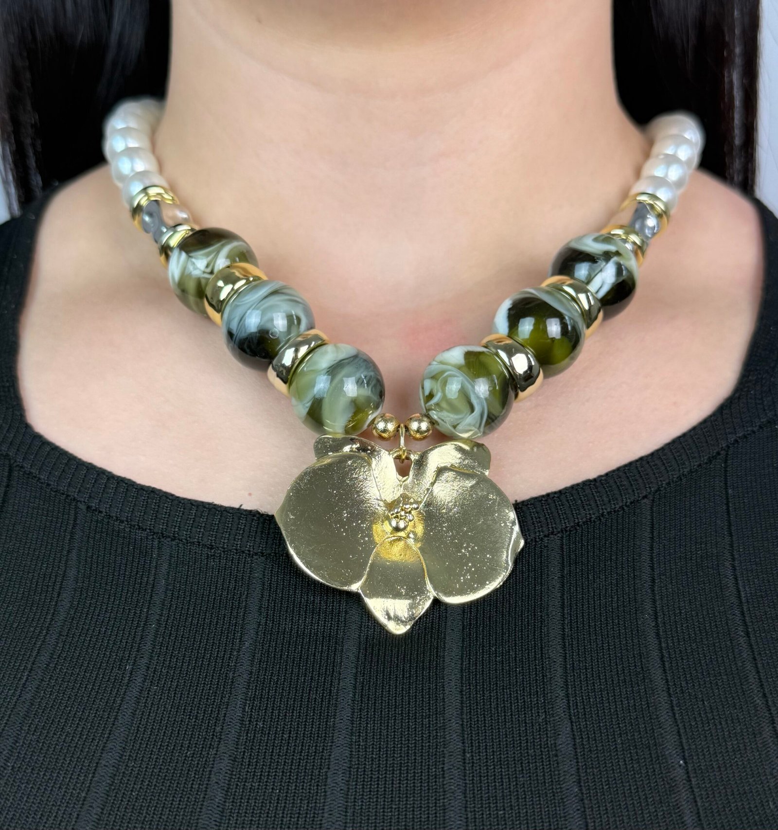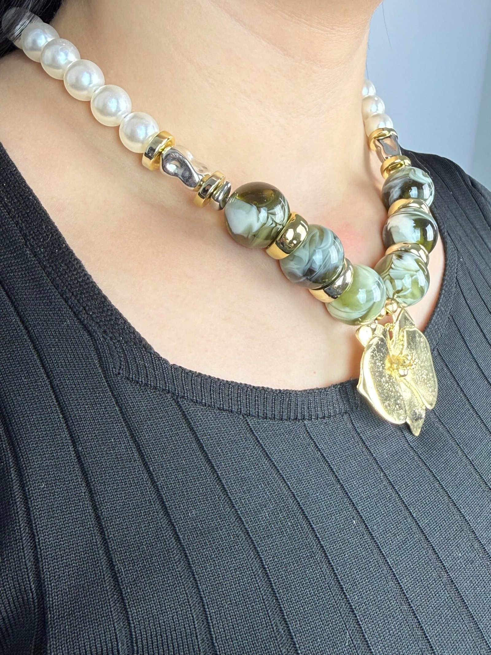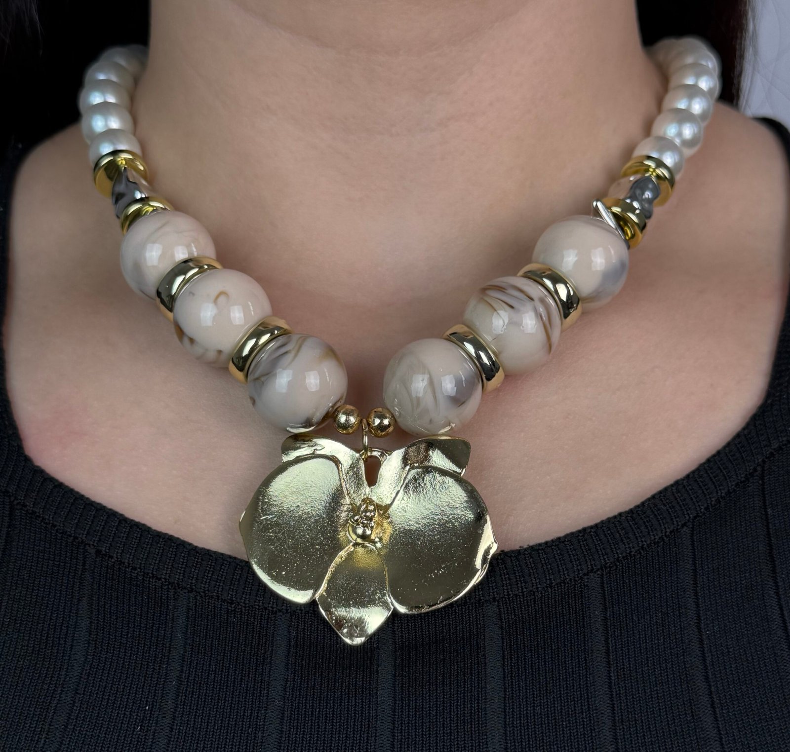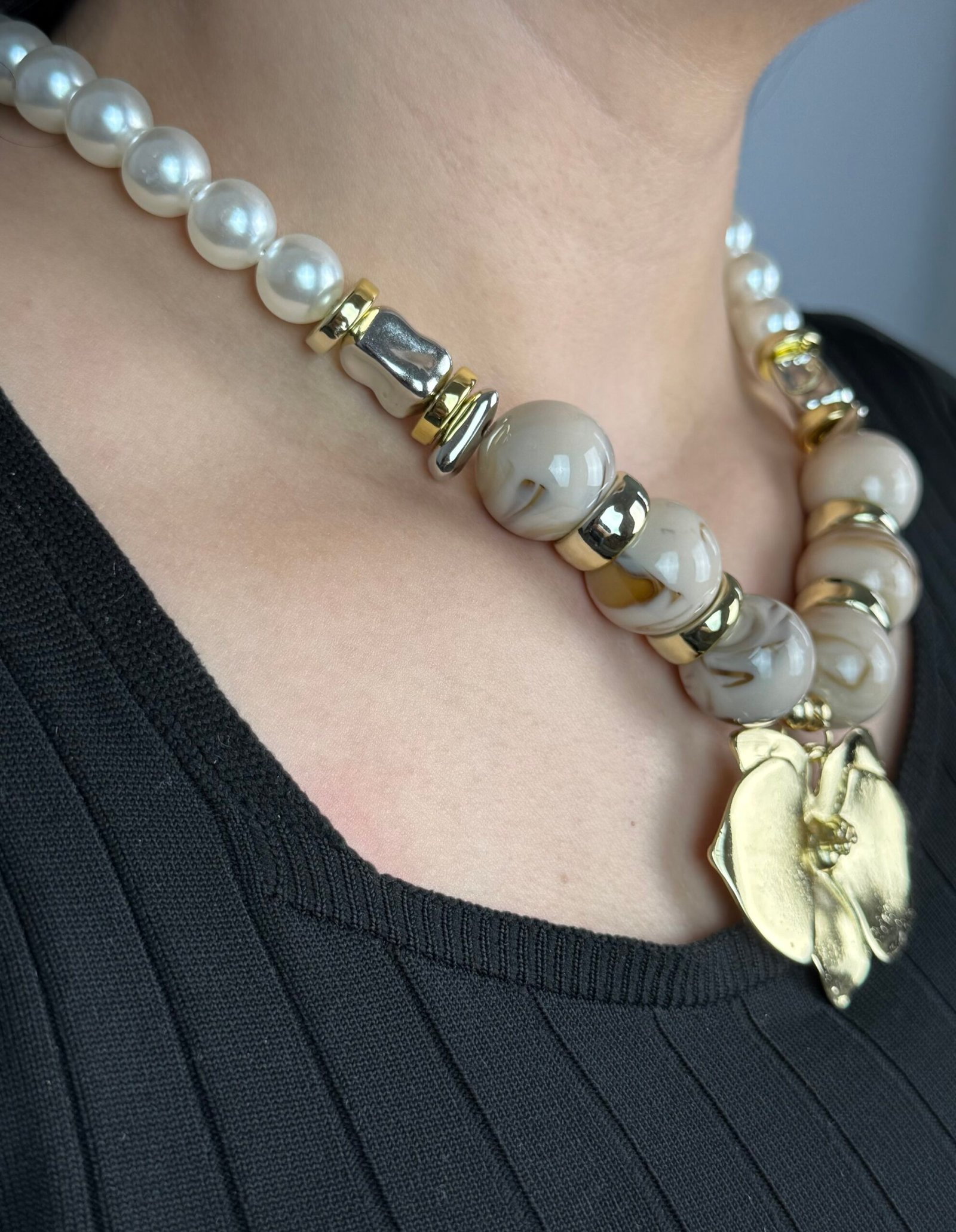 Un collier imposant composé de grosses perles alternant entre le blanc nacré et un gris marbré effet pierre.