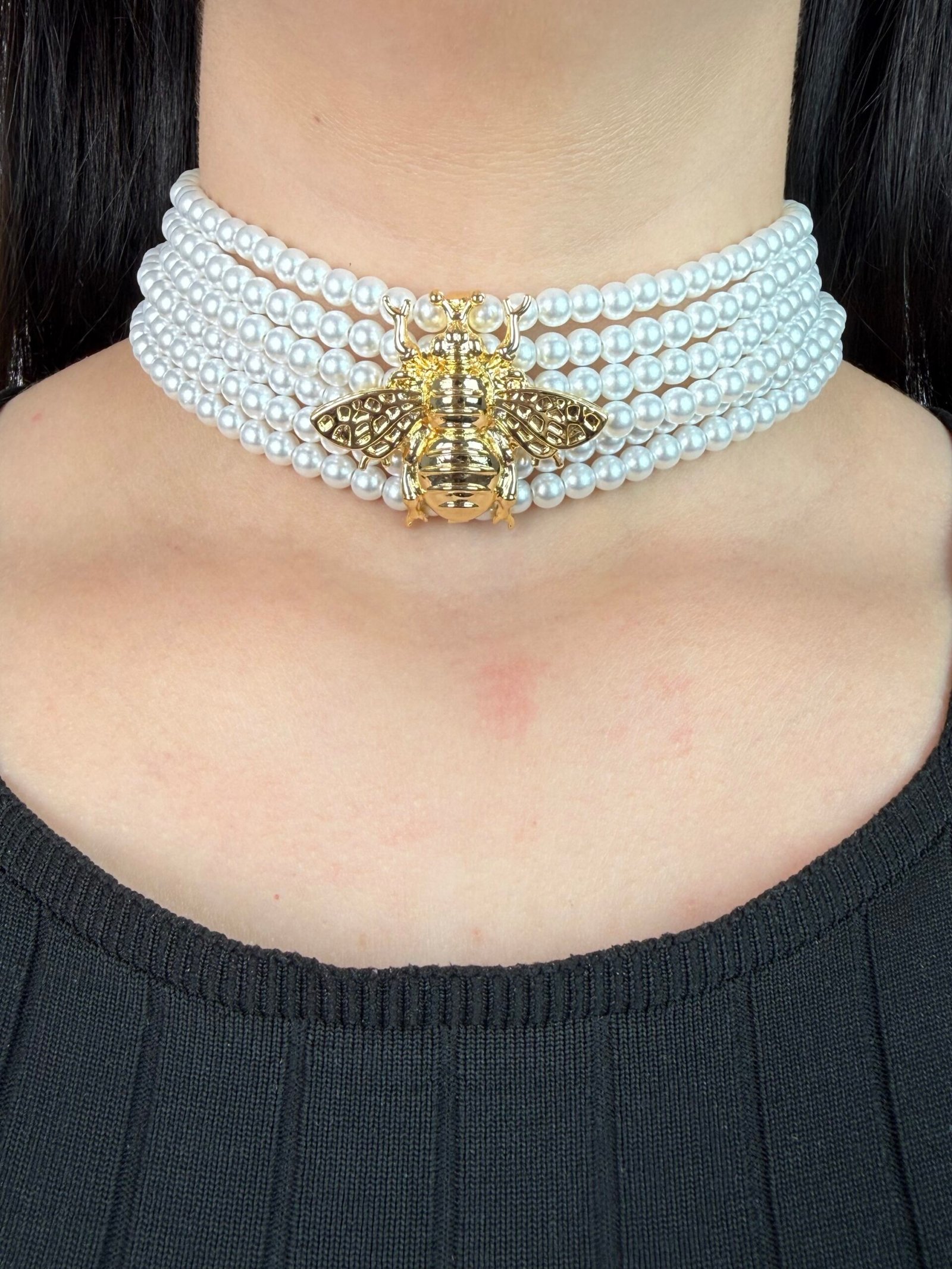 Sublimez votre style avec ce collier choker raffiné composé de plusieurs rangées de perles délicates, rehaussé d’un magnifique pendentif abeille doré au centre. Symbole d’élégance et de caractère, il apporte une touche chic et originale à toutes vos tenues.