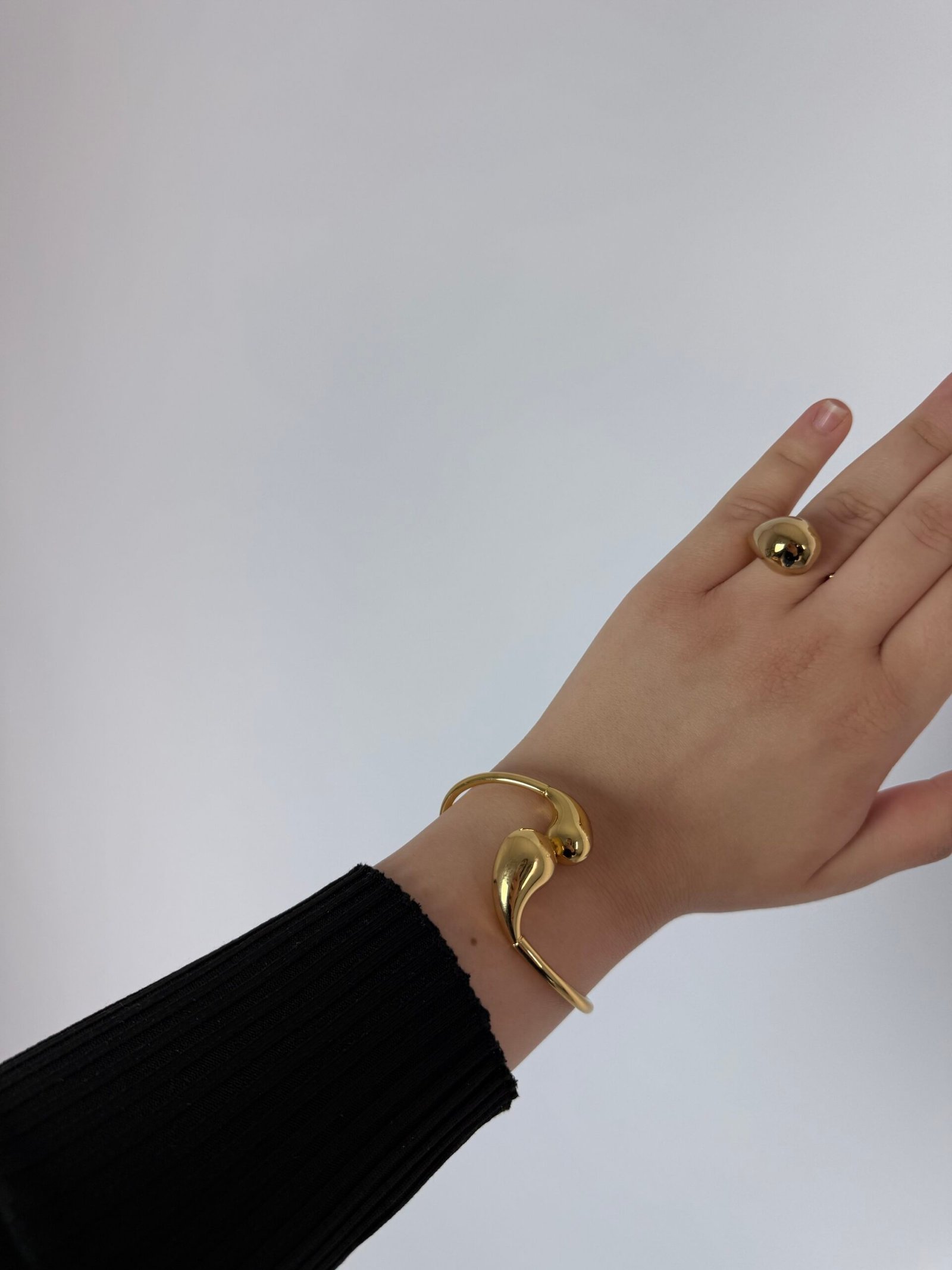 Un ensemble minimaliste et sculptural composé d’un collier, d’un bracelet , boucles d’oreilles et d’une bague assortie.