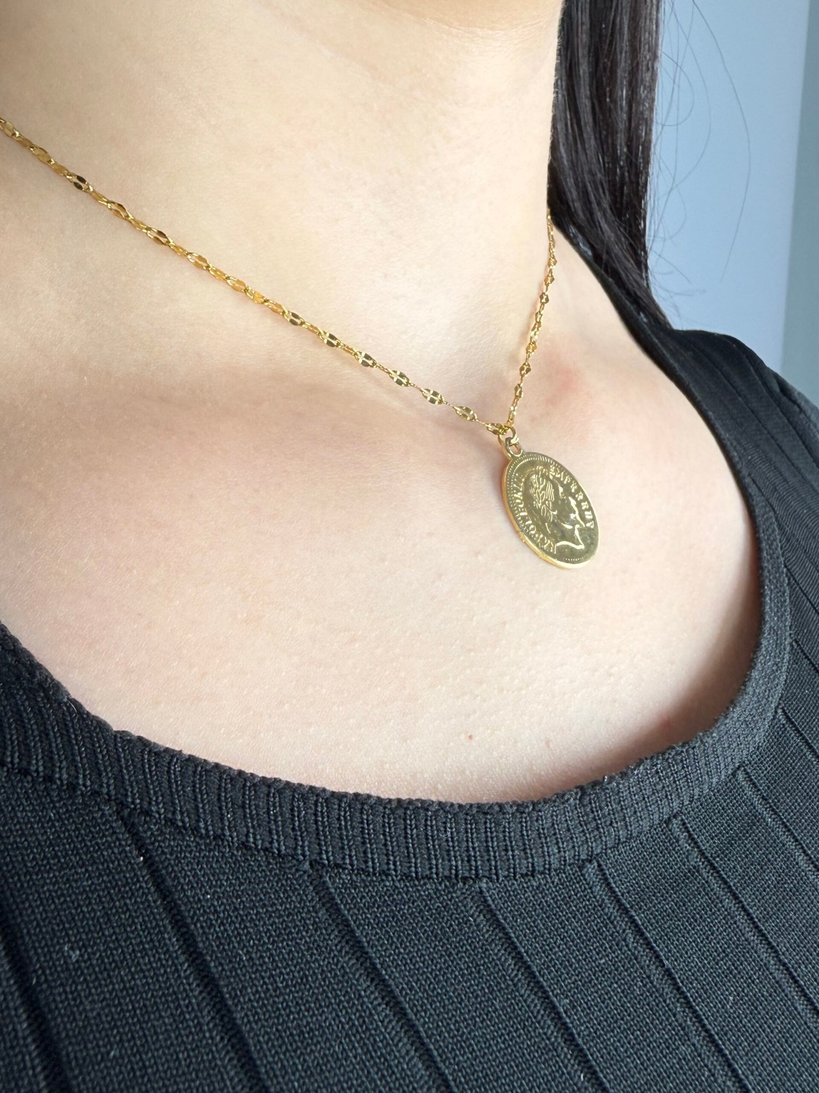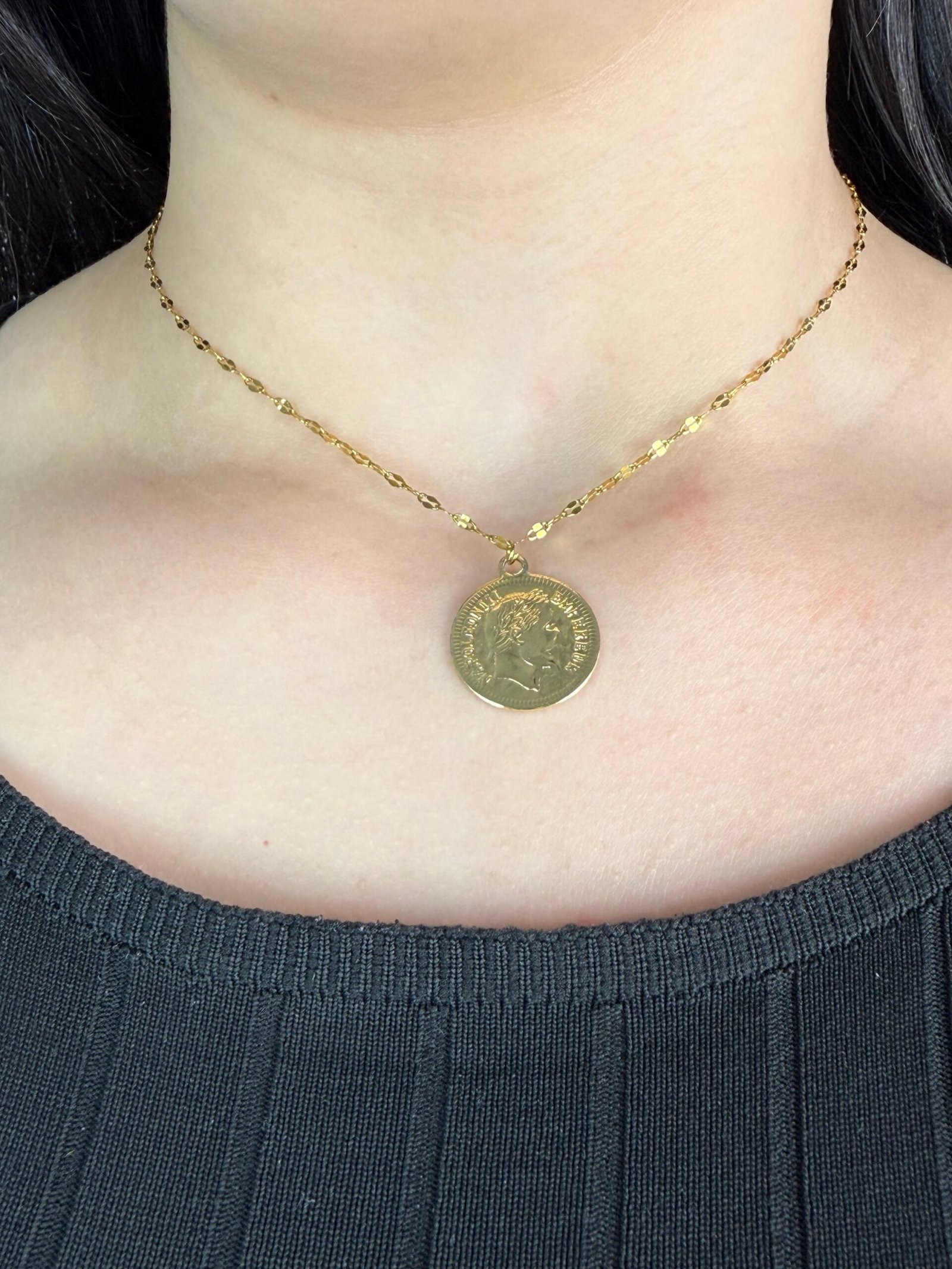 Une chaîne délicate aux maillons travaillés, ornée d’un pendentif médaille gravé à l’effigie d’un profil impérial.